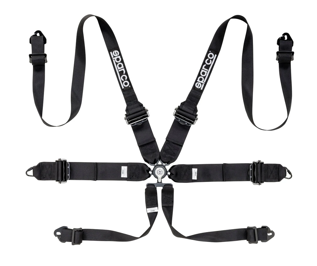 Sparco’s full line of harnesses works in unity with our competition seats. Crafted from high-quality fabric and fitted with durable fasteners, each harness restrains the body for added safety and protection. Our 6-point Hans-compatible harness features 3-inch lap straps and shoulder straps that taper from 3 inches to 2 inches. This tapered design allows for the integration of a Hans device. Each strap attaches in the center using an aircraft-quality quick-release buckle with integrated anti-submarine belts. The lightweight aluminum adjusters allow for smooth, quick adjustments and perfect clamping. Shoulder and sub belts attaches to the frame using snap-on fixings and Caribiner fasteners for lap belts. Available in three colors: black, blue and red. This harness is FIA approved.